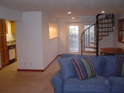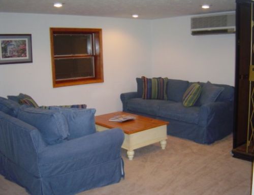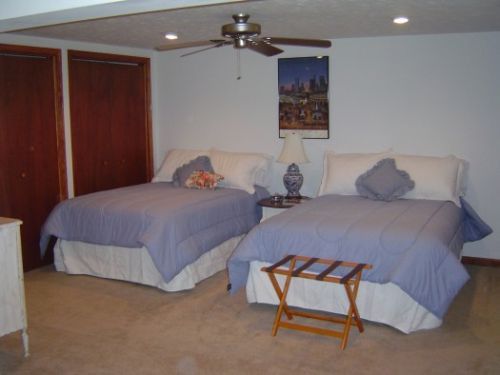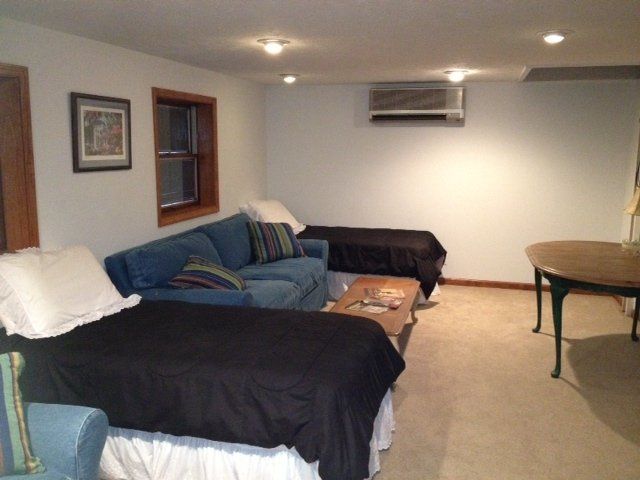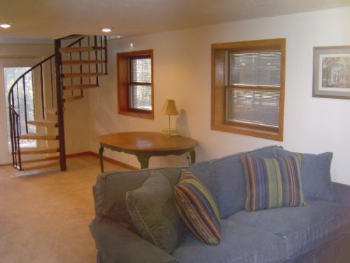 The upstairs level contains a spacious bedroom that has two twin and two full beds. The attached full bathroom has a stand up shower. The lower level which can be accessed by stairs or elevator offers increased privacy with a full kitchen, sitting room, and bedroom with two full beds and a large bathroom with stand up shower. The lower level also has two twin beds plus two sofas contain pull-out full beds.